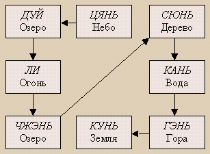 В квадратно-круговом расположении триграмм по Фу-си триграмма СЮНЬ противоположна (центрально-симметрична) триграмме ЧЖЭНЬ. При обходе триграмм именно переход от ЧЖЭНЬ к СЮНЬ проходит через центр и меняет направление движения: