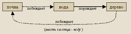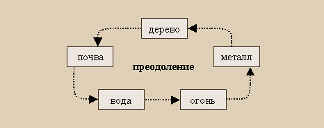 Дерево и другие элементы: взаимопреодоление. "Взаимный вред, который наносится пятью первоэлементами друг другу, заложен в природе неба и земли. Множество побеждает немногое, поэтому вода побеждает огонь. Тонкое побеждает крепкое, поэтому огонь побеждает металл. Твёрдое побеждает мягкое, поэтому металл побеждает дерево. Плотность побеждает рыхлость, поэтому дерево побеждает землю (почву). Наполнение побеждает пустоту, поэтому земля (почва) побеждает воду."