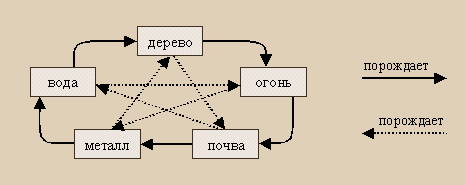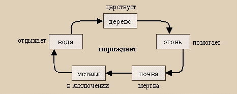 "Когда царствует дерево, огонь помогает. Как узнать, кто окажется подданным (чэнь)? То, что земля (почва) умирает, [происходит потому, что] сын [дерево, рождённое водой], должен отомстить [земле] за отца, [поскольку земля побеждает воду]."