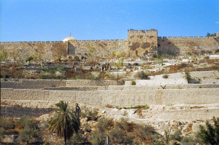 Перед ними - арабское кладбище. За стеной - купол мечети Купол Скалы.