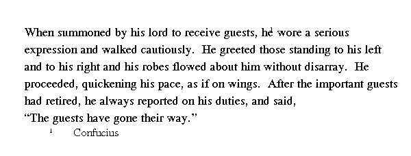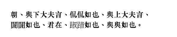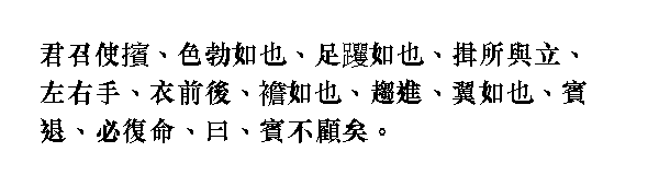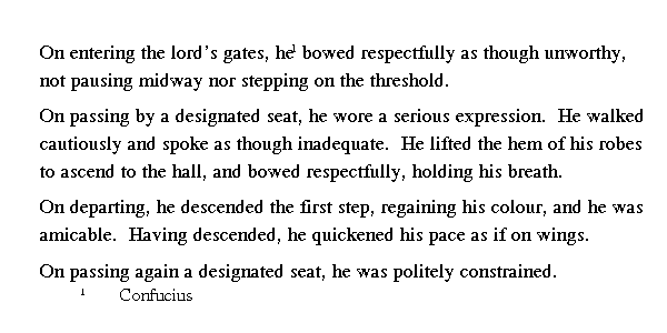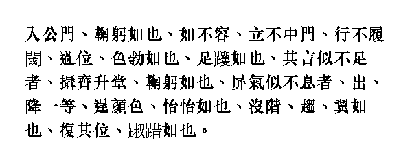 Когда [Кун-цзы] входил в дворцовые ворота, то пригибался, будто боялся, что не пройдет. Посредине ворот не останавливался и проходил, не наступая на порог. Когда подходил к престолу правителя, лицо его преображалось, колени подгибались и слов ему будто не хватало. Поднимался в зал, подбирая полы одежды, пригнувшись и затаив дыхание, словно не дышал. А когда выходил из зала и спускался на одну ступень, на вид был уже ровным и спокойным. Спускался вниз быстро, как на крыльях. Когда возвращался на свое место, казался умиротворенным.