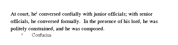 [Кун-цзы] при дворе [в ожидании выхода правителя], если разговаривал с низшими сановниками, был мягок и любезен, а если беседовал с высшими сановниками - вежлив и прям. Когда правитель выходил, он выказывал благоговение, но держался с достоинством.