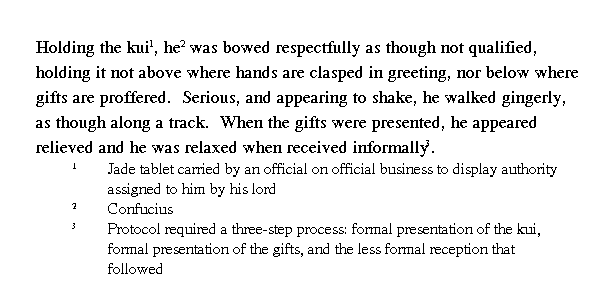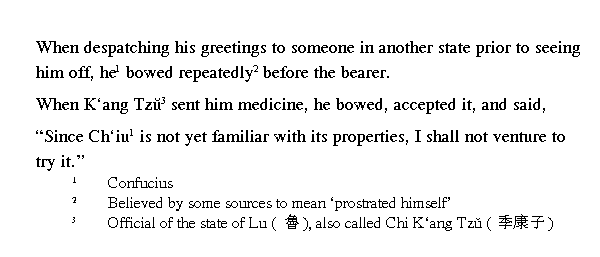 [Кун-цзы] нес нефритовую табличку так, будто кланялся, будто не мог удержать ее. То поднимал ее высоко, словно приветствовал, то опускал вниз, словно делал подношение. Выражение лица его постоянно менялось, он шел мелкими шажками, не отрывая ног от пола. При поднесении подарков он был сдержан, после церемонии в частной беседе был весел.