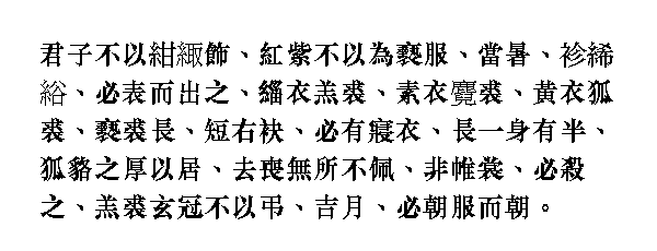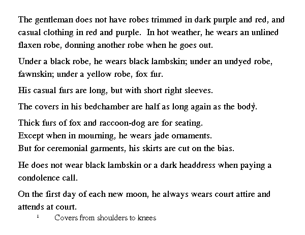 Конфуций не оторачивал своего воротника темно-красной или коричневой материей. Не употреблял на домашнее платье материи красного или фиолетового цветов [как цветов промежуточных, более идущих женскому полу]. В летние жары у него был однорядный халат из тонкого или грубого травяного полотна, который при выходе из дому он непременно накидывал поверх исподнего платья, [чтобы не просвечивало тело]. Поверх нагольной шубы из черного барана он надевал однорядку, поверх пыжиковой - белую, а поверх лисьей - желтую. Меховой халат длинный (для теплоты), с коротким правым рукавом (для удобства в работе). Во время поста он непременно имел спальное платье длиною в 11/2 роста [для прикрытия ног]. В домашней жизни он употреблял пушистые лисьи и енотовые меха. По окончании траура он носил [на поясе] всевозможные привески. Если это было не парадное платье [для представления ко двору и жертвоприношений, которое делалось из прямых полотнищ с оборками вокруг поясницы - юпка], то оно непременно скашивалось вверху. Барашковая шуба и черная шапка не употреблялись при визитах с выражением соболезнования. Первого числа каждого месяца он непременно одевался в парадное платье и являлся ко двору.