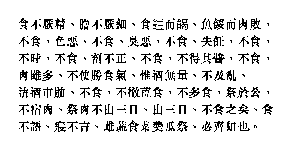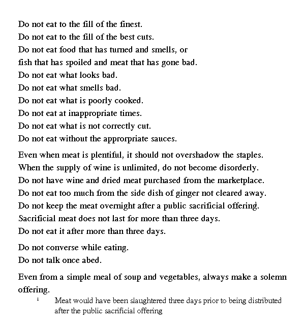 Если каша была не из отборного обрушенного зерна, если мясо было нарезано не достаточно мелко, если каша от долгого хранения прогоркла, ничего этого он не ел. Испортившуюся рыбу и протухшее мясо не ел. Продукты, имевшие дурной вид и запах, не ел. Плохо сваренное не ел, несвежее не ел. Неправильно разделанное мясо не ел. Если не было соответствующей приправы, не ел. Хотя бы мяса было и много, не ел его больше, чем риса. Только в вине не ограничивал себя, но не пил допьяна. Вина и мяса, купленного на рынке, не употреблял. От имбиря никогда не отказывался. [Обычно] ел немного.