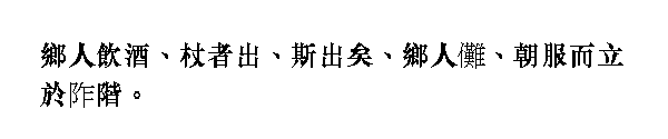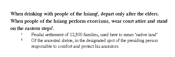 ╚жители общины╩ - в тексте: сян жэнь, досл. ╚жители сяна╩. сян ≈ наименование одного из типов общины. Хуан Цичун трактует сян в его современном значении ╚уезд╩, отсюда сян жэнь ≈ ╚правитель уезда╩: ╚When the prefecture minister was hosting the drinking ceremony...╩ [Хуан]. ╚Церемония распития вина╩ совершалась в связи с совершеннолетием членов общины и одновременно наиболее уважаемых ее членов. Обычно отличалась обильным возлиянием.