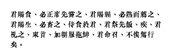 Когда правитель жаловал его кушаньем, то он всегда сначала pacnpaвлял циновку и тотчас отведывал его. Когда правитель жаловал сырым мясом, то всегда отваривал его и прежде подносил предкам. Когда правитель жаловал живой скот, то всегда откармливал его. На трапезе у правителя, дождавшись, когда тот принесет жертву предкам, первым начинал есть.