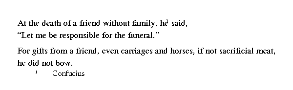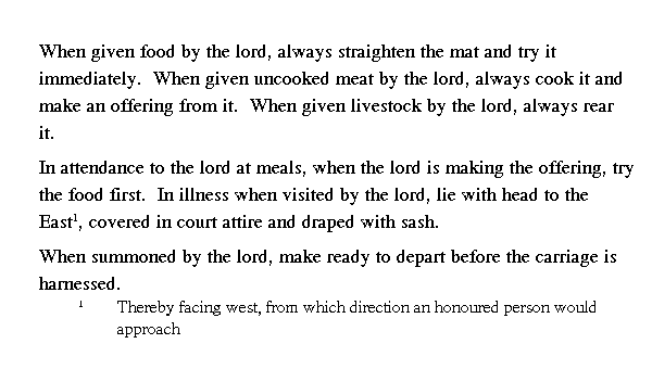 Когда правитель повелевал прибыть [во дворец], Кун-цзы, не дожидаясь, пока заложат повозку, отправлялся пешком.
