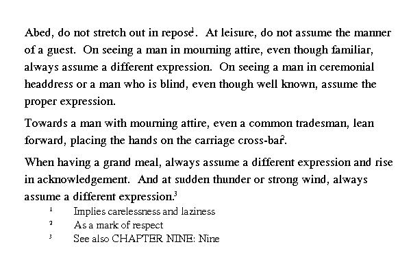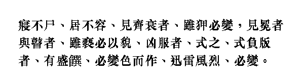 Когда [Кун-цзы] встречал человека в траурном одеянии, хотя бы и давнего знакомца, он всегда принимал [скорбный] вид. Когда встречал кого-либо в церемониальной шапке или слепого, как бы часто ни видел их, всякий раз был почтителен. Когда сидя в повозке, встречал одетого в траур, то отвешивал поклон, опершись на поручни. Когда встречал людей, несущих государственные подворные списки населения, был так же почтителен к ним. Когда видел щедро накрытый стол, всегда вставал с выражением почтения на лице. Во время грозы и бури он всегда менялся в лице.