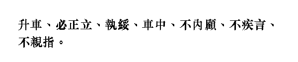 [Кун-цзы] поднимался на повозку, держа прямо спину и ухватившись за веревочные поручни. Сидя в повозке, назад не смотрел, быстро не говорил и распоряжений не давал.