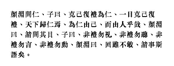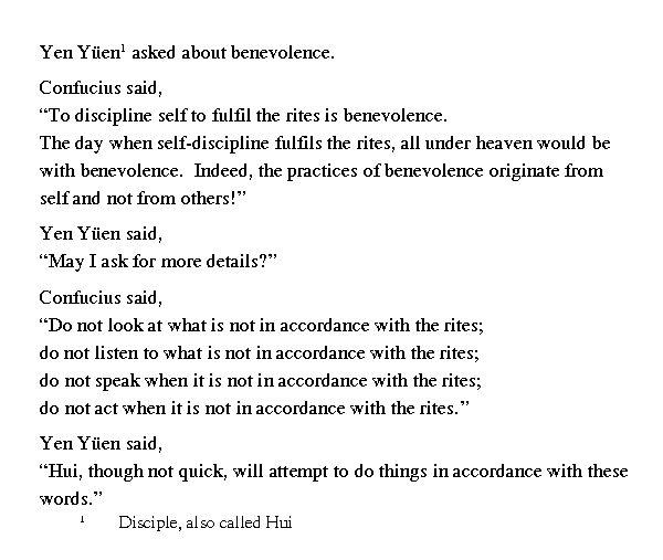 ≈ Преодолеть себя и вернуться [в словах и поступках] к Правилам - в этом заключается человеколюбие. Если однажды преодолеешь себя и возвратишься [в словах и поступках] к Правилам, то в Поднебесной назовут тебя обладающим человеколюбием. Человеколюбие зависит от самого человека. Как оно может зависеть от других людей?