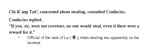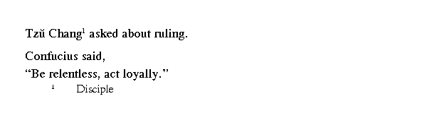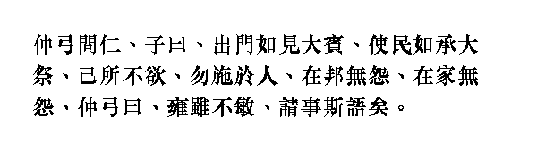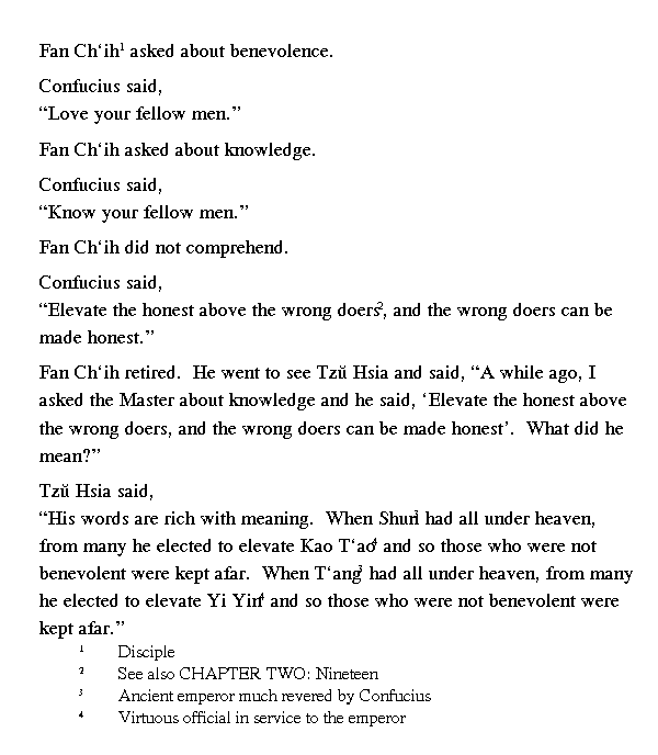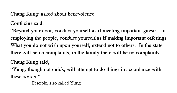 ≈ Вне дома относись к людям, словно встретил важных гостей. Используя народ, веди себя, словно совершаешь большое жертвоприношение. Не делай человеку того, чего не пожелаешь себе. Не допускай вражды в государстве, не допускай вражды в семье.