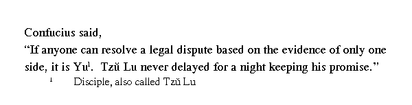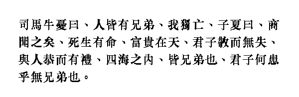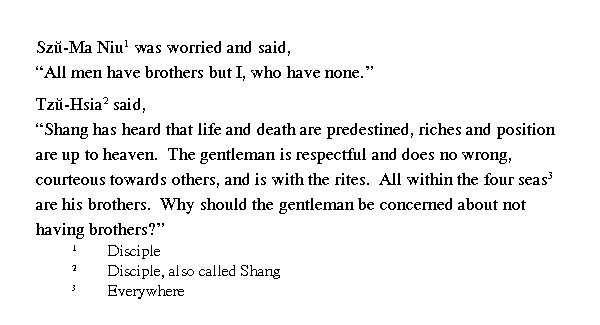 ≈ Я слышал, что жизнь и смерть зависят от воли Неба, знатность и богатство - во власти Неба. Если благородный муж почтительно исполняет дела; не совершает ошибок, вежливо относится к людям и соблюдает Правила, то в пределах четырех морей ему все≈братья. Зачем благородному мужу печалиться, что у него нет братьев?
