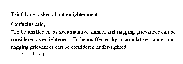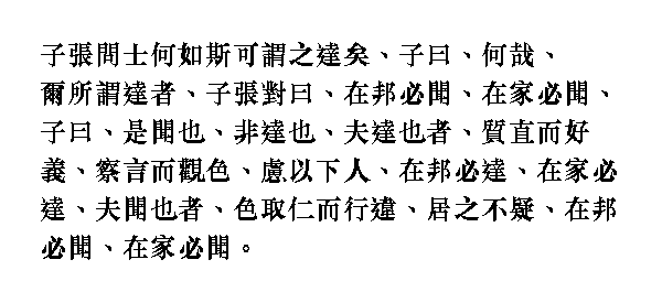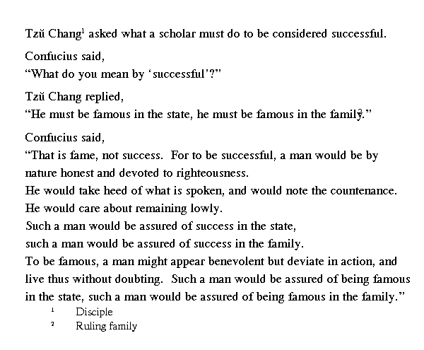 ≈Это человек известный, а не выдающийся. Выдающийся же обладает природной прямотой, любит справедливость, вникает в слова людей и следит за выражением их лиц, заботится о том, чтобы быть ниже других. Такой будет обязательно выдающимся в государстве и будет обязательно выдающимся в семье. Что же касается известного, то он лишь внешне проявляет человеколюбие, а на деле не таков. Он живет, не испытывая сомнений. Такой и будет обязательно известным как в государстве, так и в семье.