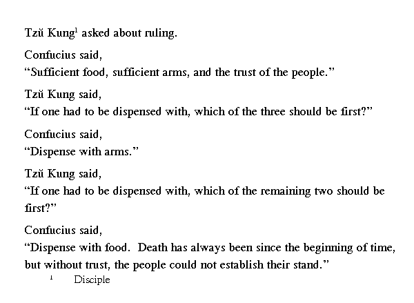≈ Отказался бы от продовольствия. Смерти никому из людей не избежать, но если народ перестанет доверять, то [государству] не устоять.