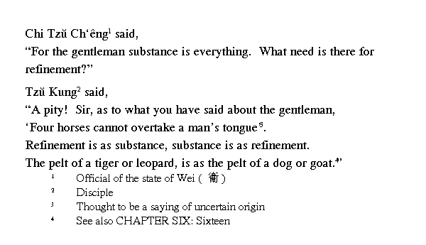 ≈ К сожалению, Вы ошиблись в оценке благородного мужа, а слетевшее с языка слово не догонит и четверка коней. Сущность и вэнь-культура одинаково важны [для благородного мужа]. Сняв шерсть, шкуру барса или тигра не отличишь от голой шкуры собаки или овцы.