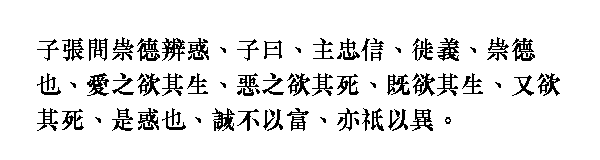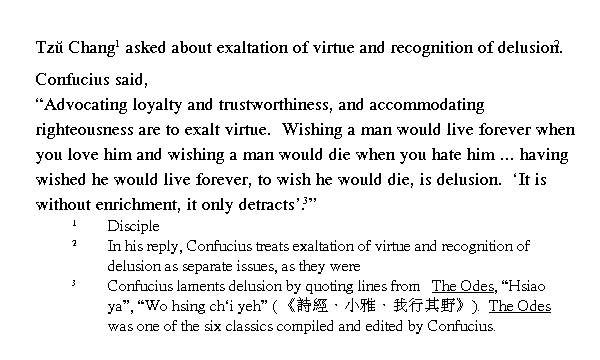 ≈ Руководствуйся преданностью и искренностью, действуй во имя справедливости≈так приумножишь добродетель. Когда любят человека, желают ему долгой жизни; когда ненавидят человека, желают его скорой смерти. Желать жизни или смерти [человека] ≈ это и есть заблуждение. Если так будешь поступать, то ничего не добьешься, а люди назовут это глупостью.