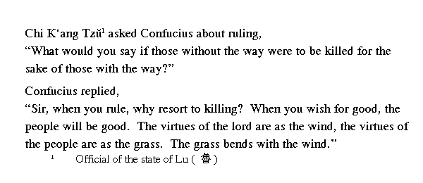 ≈ Разве тот, кто осуществляет истинное правление, казнит людей? Коль Вы стремитесь к добру, то и народ станет добрым. Добродетель благородных мужей - ветер, добродетель маленьких людей - трава. Куда дует ветер, туда и склоняется трава.