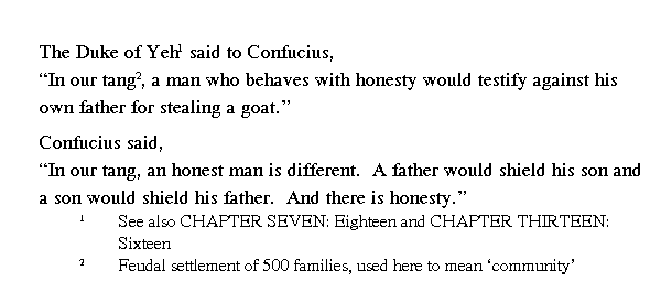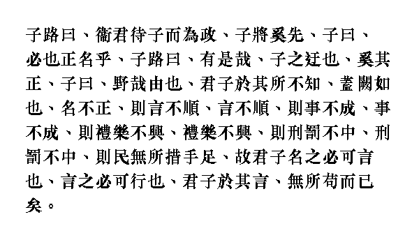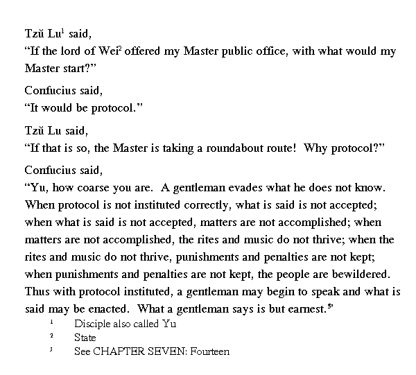 "Как ты необразован, Ю! Благородный муж проявляет осторожность по отношению к тому, чего не знает. Если имена неправильны, то слова не имеют под собой оснований. Если слова не имеют под собой оснований, то дела не могут осуществляться. Если дела не могут осуществляться, то ритуал и музыка не процветают. Если ритуал и музыка не процветают, наказания не применяются надлежащим образом.. Если наказания не применяются надлежащим образом, народ не знает, как себя вести. Поэтому благородный муж, давая имена, должен произносить их правильно, а то, что произносит, правильно осуществлять. В словах благородного мужа не должно быть ничего неправильного".
