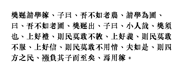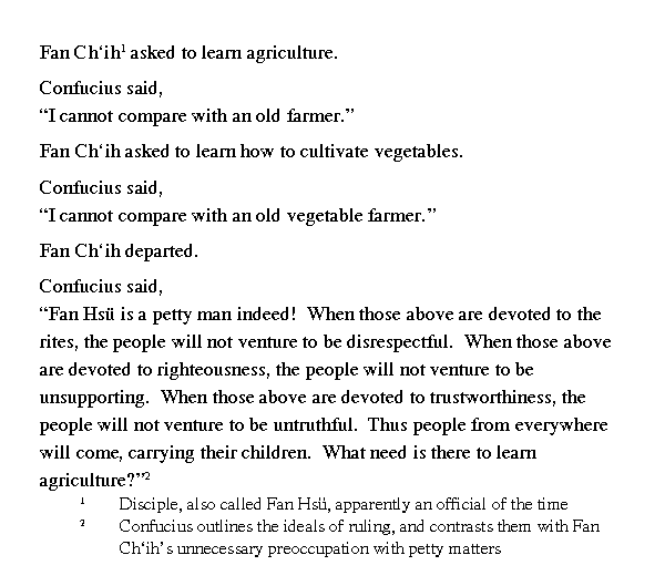 "Фань Сюй воистину низкий человек. Если в верхах любят ритуал, то в народе нет таких, кто бы осмеливался не проявлять почтительности. Если в верхах любят долг, то в народе нет таких, кто бы осмеливался не подчиняться. Если в верхах любят правдивость, то в народе нет таких, кто бы осмеливался не быть искренним. Если [наверху] будут поступать так, то со всех четырех сторон к ним будут идти люди с детьми за спиной и тогда к чему будет нужно самим заниматься земледелием?"