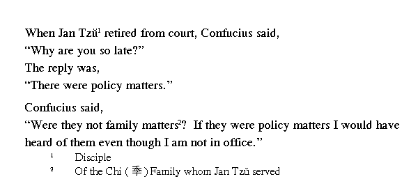 Учитель ответил: "Необходимо начать с исправления имен". Цзы-лу спросил: "Вы начинаете издалека. Зачем нужно исправлять имена?"