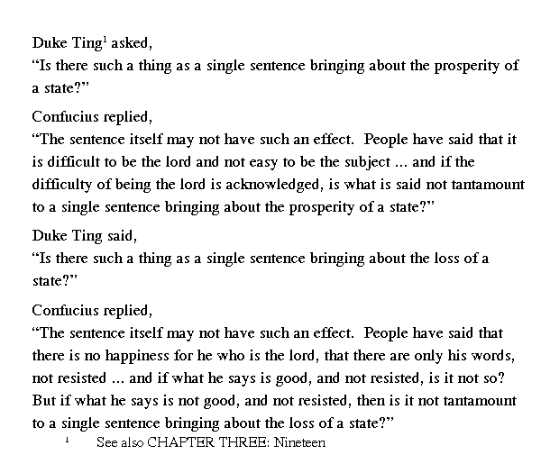 ≈ Одно такое слово трудно найти, но сказано: ╚Быть правителем очень трудно, и сановником быть также нелегко╩. Если правитель понимает трудности управления [и проявляет осмотрительность] - не близко ли это к тому, когда одним словом можно достичь процветания страны?