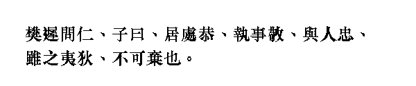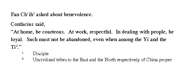 ≈ Дома держись скромно, к делам относись уважительно, с людьми будь искренним. Не отказывайся от всех эти [принципов], даже отправляясь к варварам.