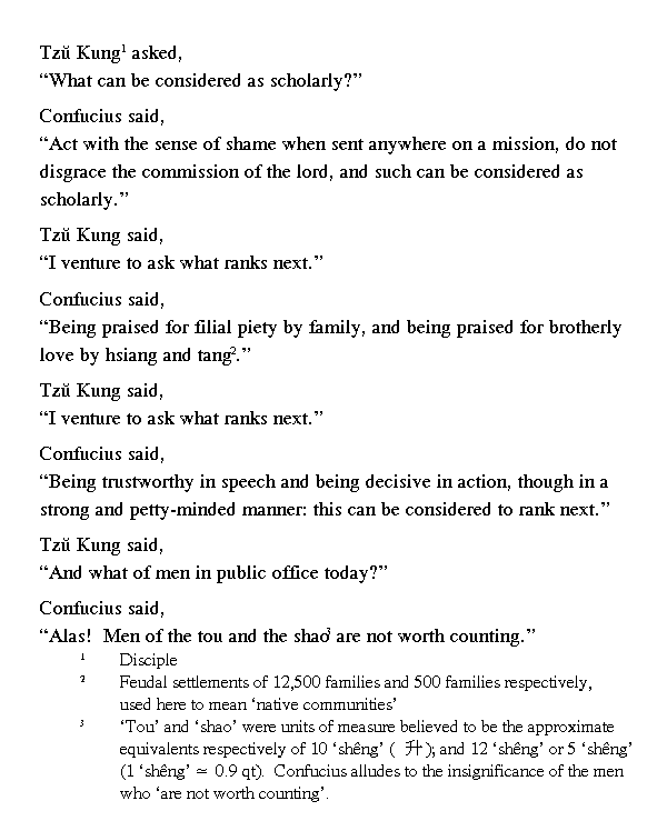 Учитель сказал: "Хотя он и прочитал триста стихотворений "Ши цзин", если ему передать [дела] управления государством, он не справится с ними. Если его послать в соседние страны, он не сможет самостоятельно отвечать на вопросы. Какая польза от того, что он столько прочитал?"