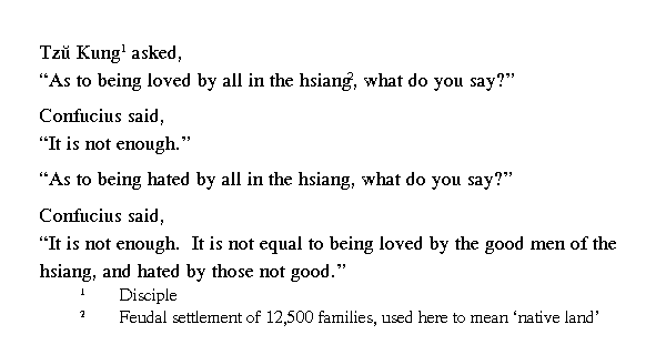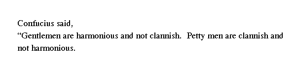 ≈Благородный муж стремится к единству через разномыслие, но не стремится к единству через послушание. Маленький человек стремится к единству через послушание, но не стремится к единству через разномыслие.