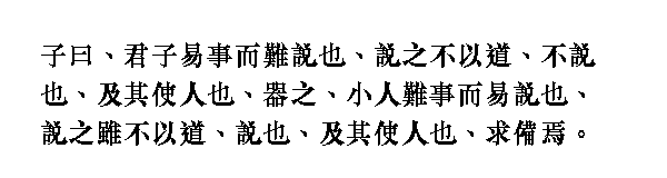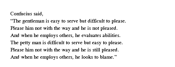 ≈ Благородному мужу легко служить, но трудно угодить. Если, угождая ему, [даже] нарушишь Дао-Путь, он будет недоволен. Он использует людей [на службе] сообразно их способностям. Маленькому человеку трудно служить, но легко угодить. Если, угождая ему, [даже] нарушишь Дао-Путь, он все равно будет доволен. Используя людей [на службе], он требует от них полного подчинения.