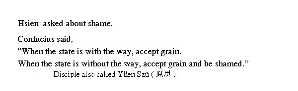 ≈ Когда в стране царит Дао-Путь, а [чиновники] думают [только] о жалованье, и когда страна лишилась Дао-Пути, а [чиновники продолжают] думать [только] о жалованье, - вот это и есть стыд.