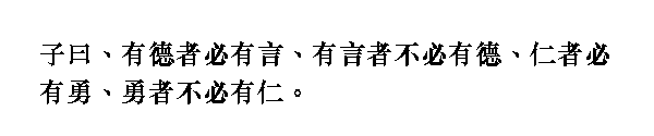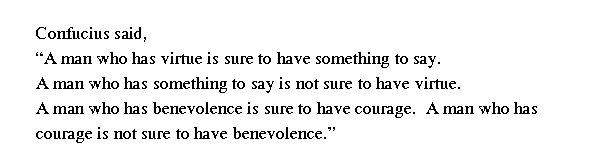 ≈ Тот, кто обладает добродетелью, непременно произносит слова, [заслуживающие внимания], но тот, кто произносит слова, [заслуживающие внимания], не обязательно добродетелен. Обладающий человеколюбием непременно отважен, но отважный не обязательно человеколюбив.