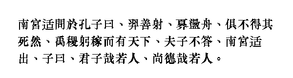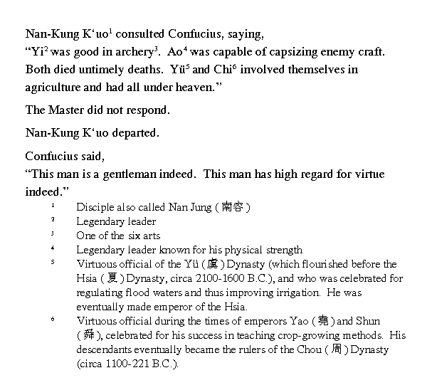 Конфуций своим молчанием одобрил оценку героев древности, данную Наньгун Ко, показывая тем самым ученикам, что обладание большой физической силой и ловкостью не главное. Главное - уметь приложить свои силы в нужном направлении, а это прежде всего земледелие.