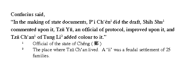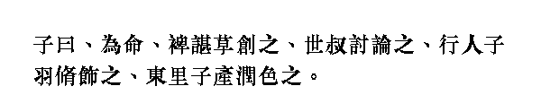 ≈ Когда [в царстве Чжэн] готовилось послание [в другое царство], то Би Чэнь составлял текст вчерне, Ши Шу высказывал замечания, Цзы Юй, ведавший внешними делами, исправлял текст, а Цзы Чань из Дунли1 доводил его до совершенства2.