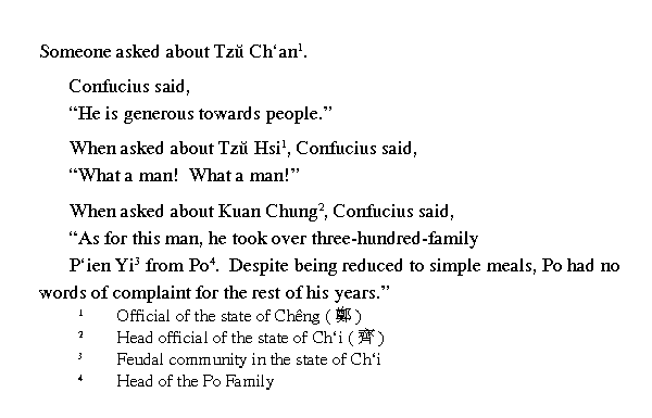 1 Ян Боцзюнь отмечает, что в период Чуньцю встречаются имена трех разных Цзы Си. Здесь речь идет, по-видимому, о Гунсунь Ся, и в ответе Конфуция звучит плохо скрываемая неприязнь. Хуан Цичун считает, что Цзы Си, воспрепятствовал в свое время получению Конфуцием участка земли в царстве Чу, поэтому Учитель воздержался от каких-либо комментариев в его адрес.