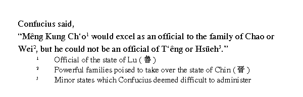 ≈ Мэн Гунчо1 мог бы быть управляющим в богатых родах Чжао и Вэй, но он не мог бы быть сановником в царствах Тэн и Сюэ2.