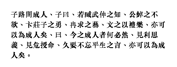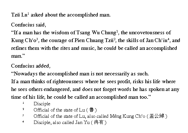 ≈ Если [соединить] ум Цзан Учжуна, бескорыстие Гунчо, храбрость Чжуан-цзы из Бянь, мастерство Жань Цю, добавить [знание] Правил и музыки, то может получиться совершенный человек.
