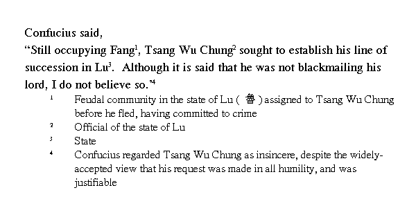 ≈ Цзан Учжун [перед бегством в Ци] просил у луского царя оставить своих наследников править в своем бывшем владении Фан. Поговаривают, что он не вымогал [согласия] у своего царя, но я не верю1.