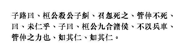 ≈ Хуань-гун девять раз объединял правителей царств, не прибегая к оружию, - в этом заслуга Гуань Чжуна. Кто сравнится с ним в человеколюбии! Кто сравнится с ним в человеколюбии!1