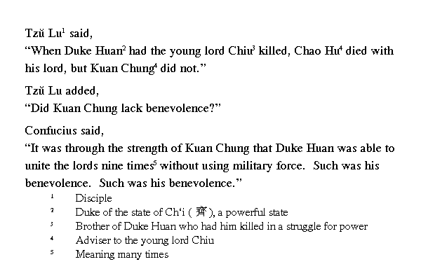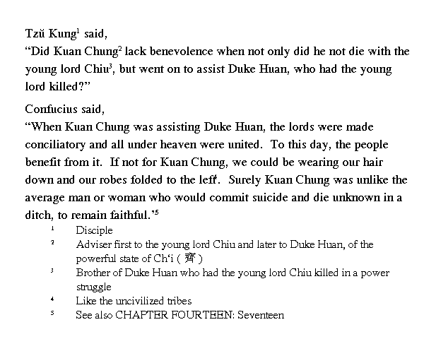 1 По традиции, Гуань Чжун должен был бы покинуть службу у царя, поэтому Цзы Лу осуждает его. Учитель объясняет, в чем заслуга Гуань Чжуна. Гуань Чжун был одним из основателей легистской школы, с которой конфуцианцы впоследствии вели жаркие дискуссии. Однако Конфуций причисляет его к ╚человеколюбивым╩ прежде всего потому, что он объединил Поднебесную и тем самым уберег ее от нашествия кочевников.