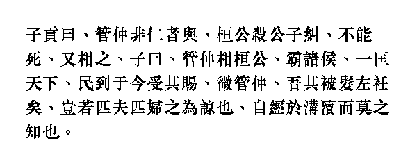 ≈ Гуань Чжун, став первым советником Хуань-гуна, [помог ему] сделаться гегемоном [среди царств], объединил и выправил Поднебесную. Народ до сих пор пользуется его благодеяниями. Если бы не Гуань Чжун, мы ходили бы с распущенными по спине волосами и запахивали одежду на левую сторону [как варвары]. Разве мог он [покончить с собою], как безвестный простолюдин, - в придорожной канаве?