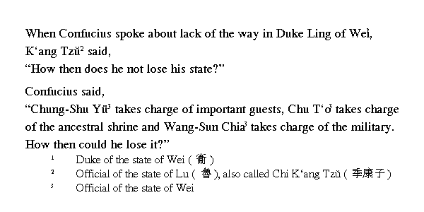 1 В данном случае Конфуций на конкретном примере показывает, какую роль могут играть профессионально подготовленные чиновники, состоящие на службе даже у такого нарушителя традиционных этических норм, каковым являлся Лин-гун.