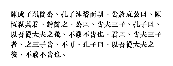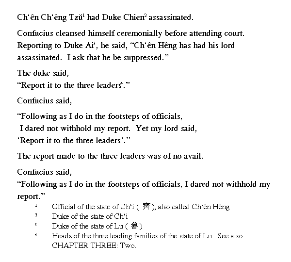Чэнь Чэнцзы убил циского правителя Цзянь-гуна1. Кун-цзы, совершив ритуальное омовение, пошел на аудиенцию к лускому царю Ай-гуну и сказал: