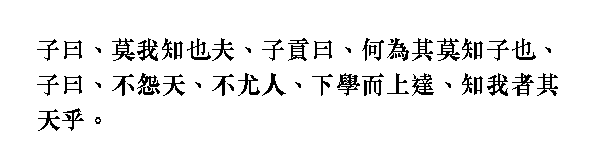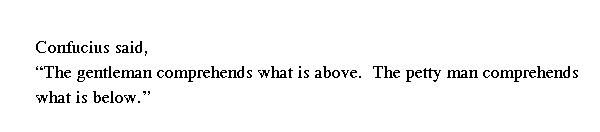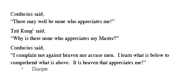Учитель сказал: "Я не обижаю небо, не обвиняю людей; изучая обыденное, достигаю вершин, но только небо знает меня".