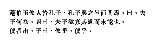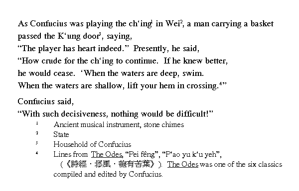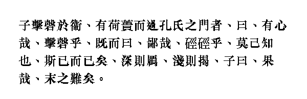 Учитель как-то в бытность его в [царстве] Вэй бил в каменный гонг. Один человек, несший на плече корзину с травой, проходил как раз мимо ворот. Он сказал: