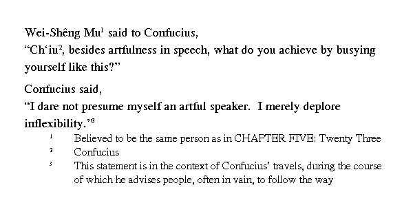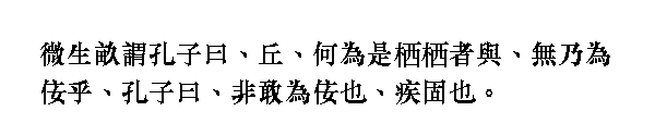 1 Вэйшэн My, уроженец царства Лу, судя по тому, что он обратился к Конфуцию по имени (Цю), был старше Учителя. Хуан Цичун полагает, что Вэйшэн My мог быть отшельником.