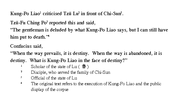 ≈ Будет ли претворен [мой] Дао-Путь [в стране] - зависит от судьбы2, потерпит ли крах [мой] Дао-Путь [в стране] - зависит от судьбы. Разве может Гунбо Ляо спорить с судьбой?