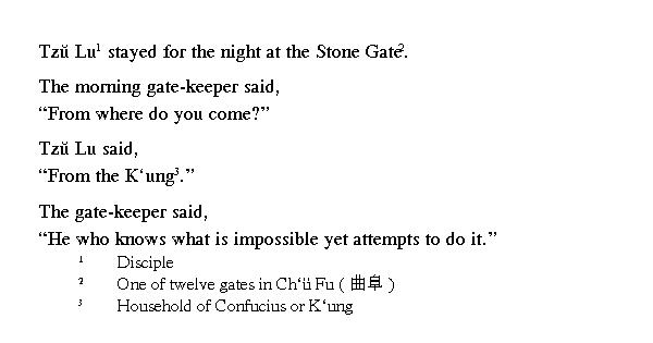 Цзы Лу заночевал у ворот Шимэнь. Утром стражник спросил: