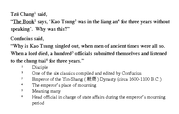 ≈ В ╚[Книге] истории╩ сказано, что Гао-цзун1, соблюдая траур, жил в соломенной хижине и три года не говорил. Что бы это значило?