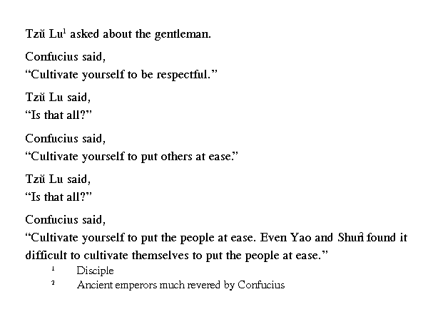 ≈ Совершенствуй себя, чтобы принести спокойствие народу. Совершенствовать себя, чтобы принести спокойствие народу, ≈ разве не это заботило Яо и Шуня?